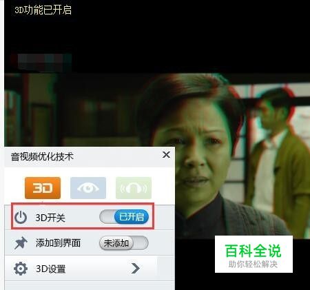 打开后,其中有3D选项,要注意开启此功能,是将普通视频,处理成特定格式。而如果播放的本地视频,已经是特殊格式,需关闭该3D功能,且可用任意播放器播放。点击3D按钮。
