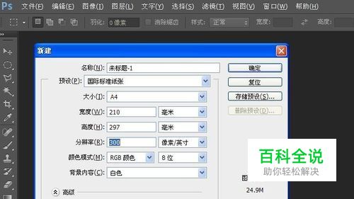 进入PS软件,新建一个画布,以A4纸大小为例。为大家介绍两种画圆的方法。