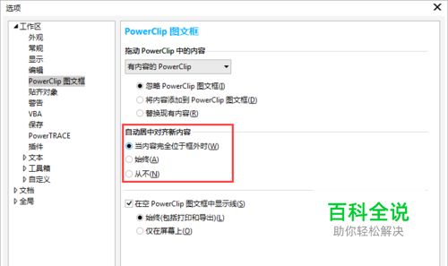 在弹出的“选项”对话框中,单击“工作区”左边三角展开工作区并选择“PowerClip图文框”选项。在右侧面板中自定义“自动居中对齐新内容”选项,然后单击以下命令之一。