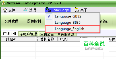 第一,远程控制软件控制端有语言选项,可以直接将语言文字转换为英文。可供选择的语言文字有英文,繁体中文以及简体中文三种语言。具体方法是安装登录网络人远程控制软件控制端,点击Language,选中代表英文的Language_English选项,网络人远程控制软件控制端界面就变为了英文版。如下图所示:
