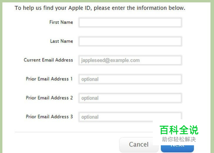 输入你的信息。除了你的名字,尽可能多地输入你的信息,然后点击“下一步”。如果苹果觉得对得上,它会给你一次收到认证邮件的机会,或者回答安全问题。 在“当前邮件”中输入你能进入的个人电子游戏账户。苹果将会把Apple ID信息发送到这个邮箱。 在“之前的电子邮箱”栏中,尽可能多地输入你能想起的旧邮箱。苹果会查看这些邮箱是否符合你的Apple ID。如果没有用于Apple ID的邮箱,那么你也可以记得安全问题的答案来回答安全问题。