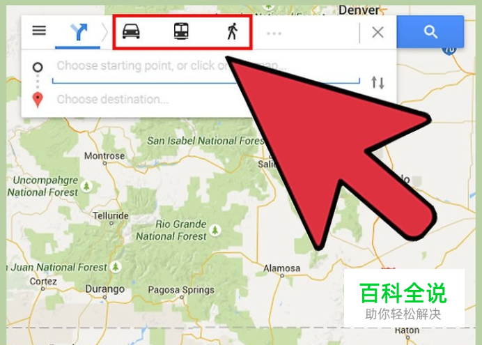 选择出行方式。当你设置多个目的地时,只能选择同一种出行方式。在路线对话框的上部点击对应的交通工具来选择出行方式。