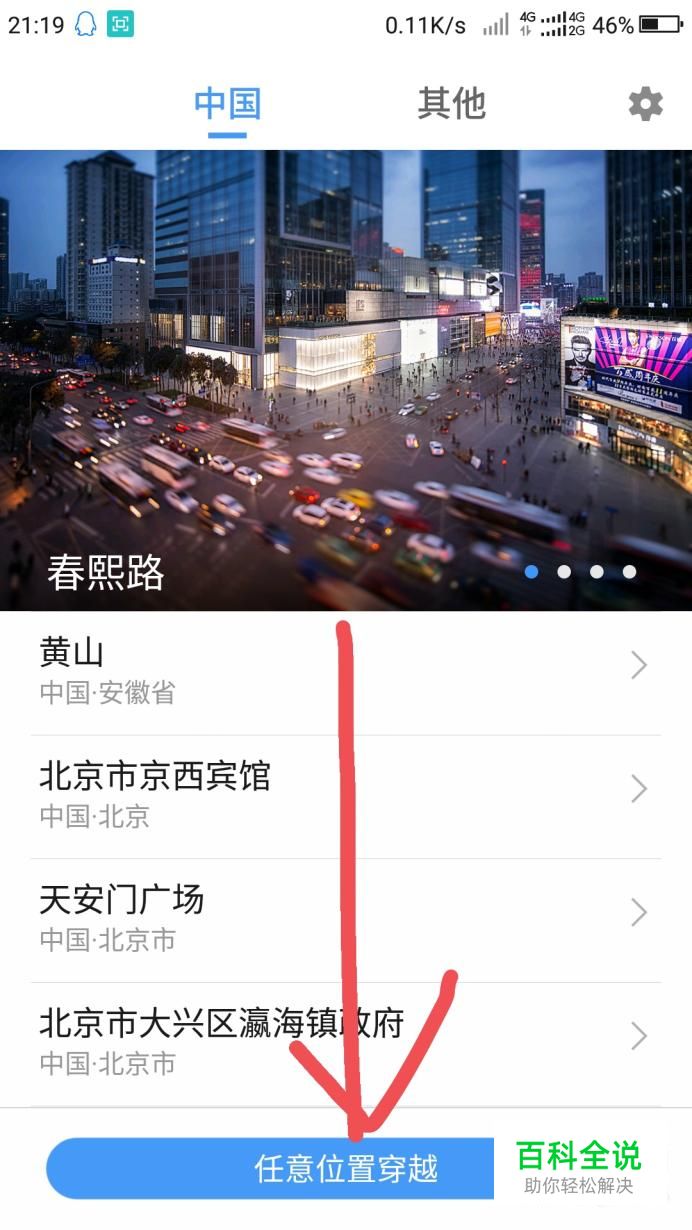 然后出现该页面,点击手机最下方的“穿越到任意位置”。