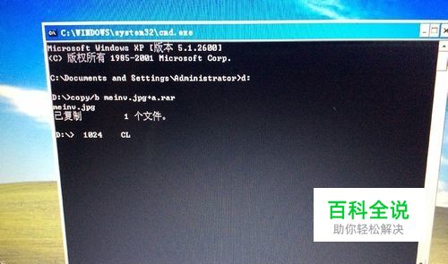 通过开始菜单运行“cmd”打开命令行提示符程序,输入“d:”,按回车键后即进入D盘。接着键入“copy /b meinv.jpg + a.rar”命令,回车后显示“已复制1个文件”,表示“a.rar”文件已合并入“meinv.jpg”文件中。