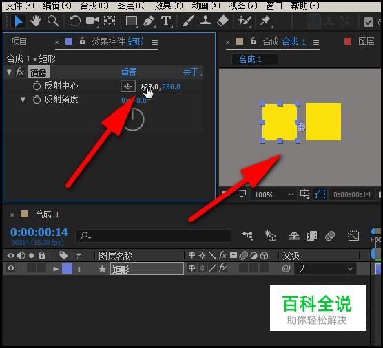 那么,就给矩形图层赋予了镜像命令了。我们目光再看效果控件面板这里。这里立即显示出镜像命令的属性面板。在这里,我们修改“反射中心”的参数,使复制出来的矩形显示在合成窗口中。