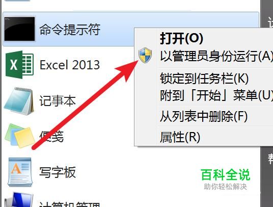 右键点击开始菜单里的‘命令提示符’,选择‘以管理员身份运行’