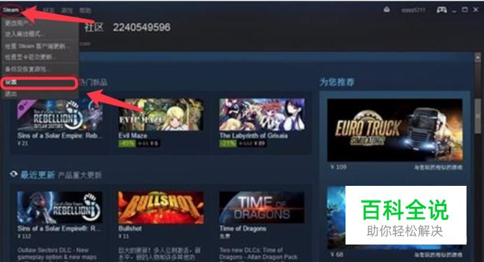 然后打开steam平台,登录自己的账号,点开steam的菜单,选择设置.