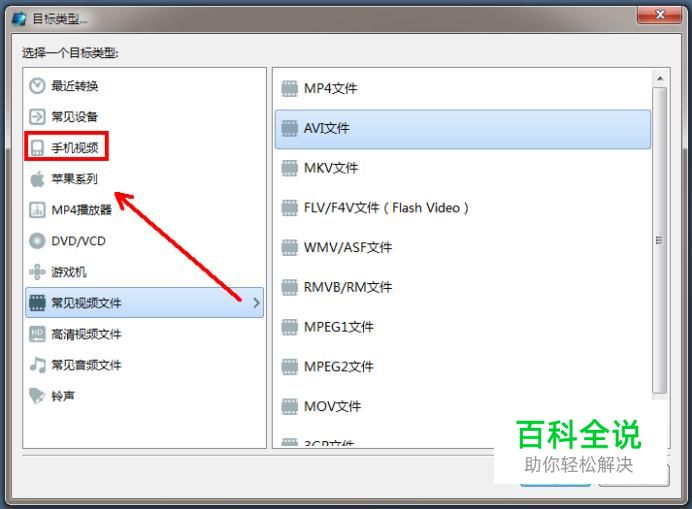 在弹出的【目标类型】窗口中选择【手机视频】选项。