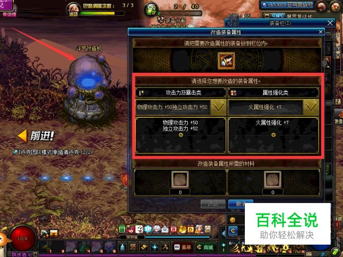 在单件装备的属性选择上,我们可以在魔界集结地的斗气改造机那里选择更改属性,我们可以选择属性-属性,属性-双攻,双攻-双攻这三种模式来更改属性,选择符合自身职业特性的搭配即可。