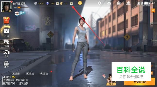 首先进入到荒野行动的游戏主页,然后点击页面上方点券右侧的【+】符号。