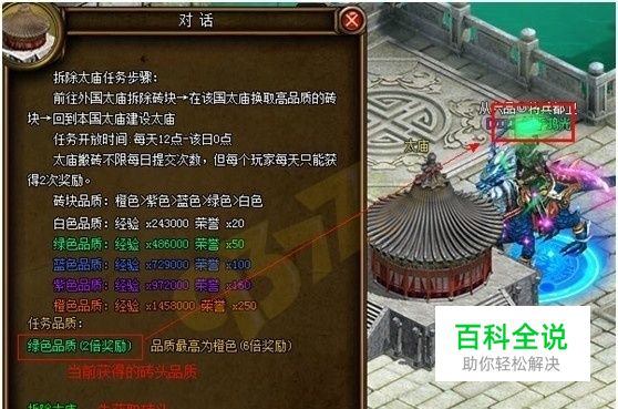 9377魅影传说太庙搬砖活动: 【活动名称】:太庙搬砖 【活动时间】:12:00 - 23:59 【双倍时间】:12:00 - 14:00 【参与条件】:55级 【活动介绍】:魅影传说太庙搬砖比较特殊,不需要活动NPC。活动开启后,玩家直接前往其他任一敌国太庙(99,152)获取砖头,再回到本国太庙处提交任务,即可完成获得奖励。太庙搬砖每天可以完成2次,在双倍活动时间内完成任务,能获得双倍奖励。 砖头品质越高,奖励越丰富。每次砖头换品质的时间间隔是1分钟。 【活动奖励】:大量经验、荣誉、幸运转盘。