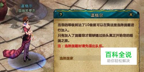 人物等级达到10级后,可以寻找爱琴海岸的“国籍管理员”温格尔选择自己的国家。 成功选择国家,即可寻找新手村传送员传送至自己所属国家的王城。