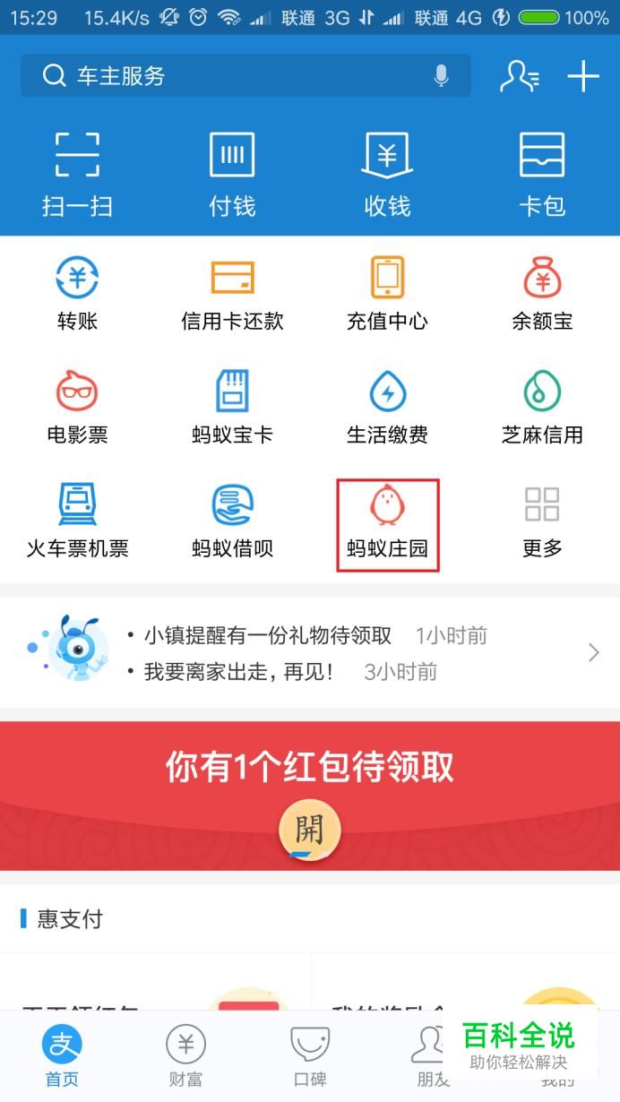首先,打开支付宝客户端应用App,在主页面中,点击“蚂蚁庄园”菜单选项。