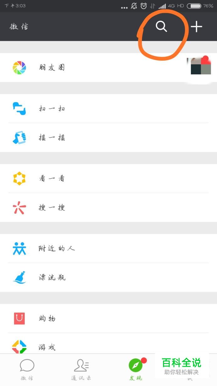你需要打开微信的页面,然后在“发现”里点击搜索的符号,如下图所示位置