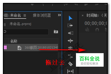 把图片素材拉到素材面板中; 然后,再把图片拖进时间轴这里来。