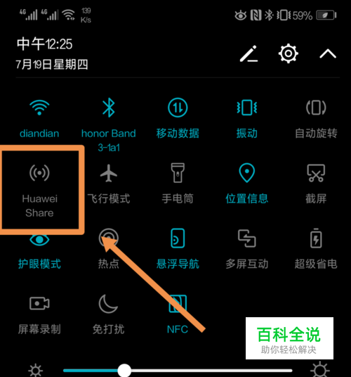 完全下滑华为手机的通知栏,点击通知栏内的“Huawei Share”,将该功能打开。
