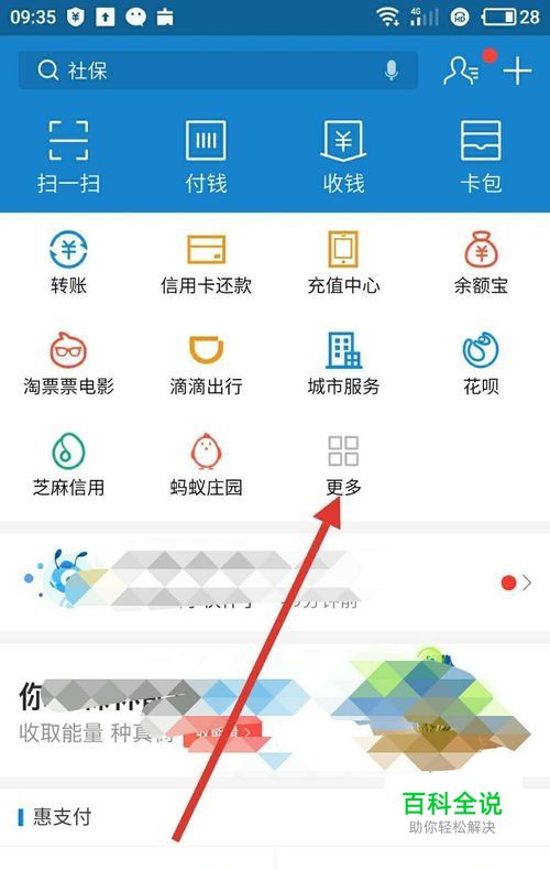打开支付宝首页,点击“更多”服务,如下图所示: