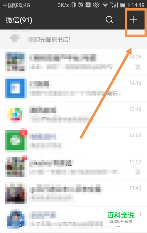 打开手机应用【微信】,进入微信首页界面,点击右上角的【加号】按钮,如图: