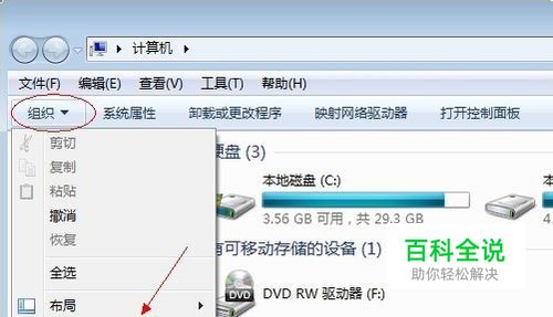 在弹出的窗口中点击“组织”,选择“文件夹和搜索选项”。