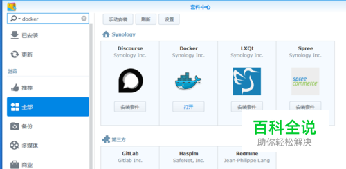 打开电脑,在浏览器中输入NAS的IP地址进入Web管理设置页面,进入“套件中心”,在“套件中心”搜索 docker,并安装