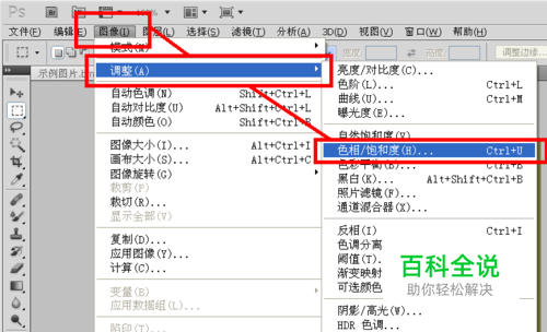 在最上方找到“图像”,在下拉菜单中找到“调整->色相/饱和度”。单击鼠标左键进入。