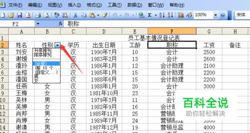点击自动筛选后,也可以使用其他的内容来筛选,例如性别、学历、工资,或者升序排列和降序排列