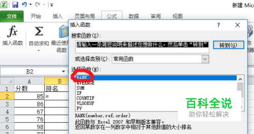 选择rank函数,(可以在搜索函数那里搜索,点击转到)