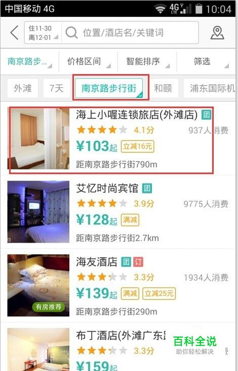 然后进入到酒店查找页面,你可以提前选择你将要入住酒店所在的街道,或者小区,如图所示。