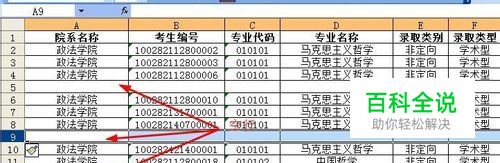 我们选择一列含有空行的数据,下图是选中了院系名称这一列,然后点击工具栏上的升序排序。