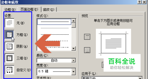 点击后打开页面边框设置窗口,在其中通过设置各个选项可以自定义word文档的边框。例如:点击设置区域的选项,可以设置边框形状。