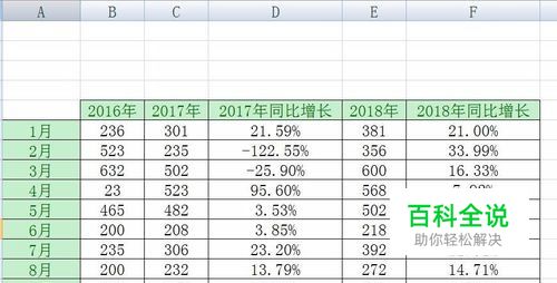 本文以一个实例进行说明,如图,我想将2016-2018年各个月的数据做成柱形图,将2017和2018同比增长做成折线图