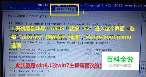 华硕笔记本在开机出现ASUS就可按“F2”(有时按了还是会跳进系统就在系统里面使用“重启系统”),进去后按上下左右可以选择“security”-“secure boot menu”按回车选择进去。