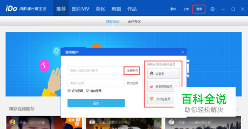 1.可以通过优酷iDo制作精致优美视频。事先先下载好优酷iDo软件到电脑上。然后注册账号并登陆(也可以用合作网站qq,新浪微博,支付宝账号一键登陆)打开该软件。