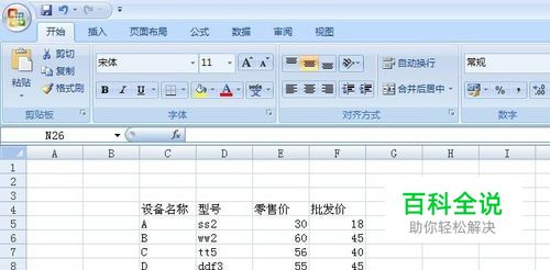 打开一个Excel的文件,输入一个简单的表格,比如设备名称型号价格统计表。需要把价格中的零售价和批发价分开,如下图所示。