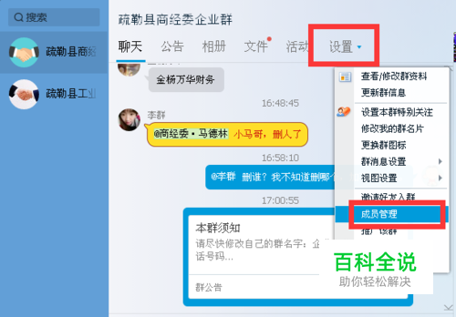 登录QQ,打开任意一个具有管理员身份的QQ群。点击群上方的“设置”-“成员管理”。如下图: