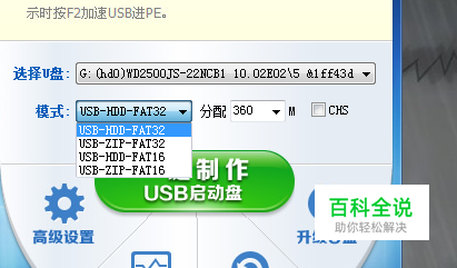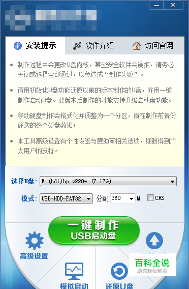 制作U盘启动程序界面如下,选择好要安装的U盘、模式选择默认、分配容量默认。然后点一键制作即可成功。