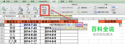 兼职员工在法定假日和周六日不上班,这里使用NETWORKDAYS函数返回兼职员工的工作日数,start_date参数引用开始上班日期而end_date参数引用结束上班日期;holidays参数引用的该段日期中的法定假期-中秋节。
