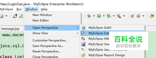 首先,打开MyEclipse Database。 选择“Window”--》“Openperspective”--》“MyEclipse Database Explorer”