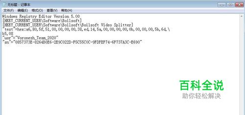 新建一个文本文档,把下述代码粘贴进去 Windows Registry Editor Version 5.00 [HKEY_CURRENT_USER\Software\Boilsoft] [HKEY_CURRENT_USER\Software\Boilsoft\Boilsoft Video Splitter] "test"=hex:a6,80,5f,51,00,00,00,00,38,ed,14,5a,00,00,00,00,0b,00,00,00,5b,6d,\ b5,08 "usr"="Voronezh_Team_2020" "sn"="0857373E-8264B0E6-2E9C022D-F5C55C0C-9FDFEF74-6F737A3C-E690"