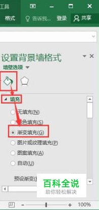 点击之后会弹出“设置背景墙格式”窗口,在窗口中选择“填充线条”中“填充”选项里的“渐变填充”