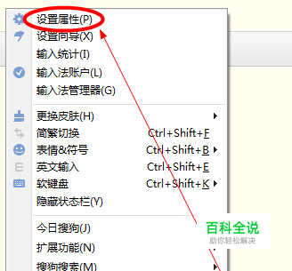 我们首先点击搜狗拼音的设置按钮,然后选择设置属性的选项,如图: