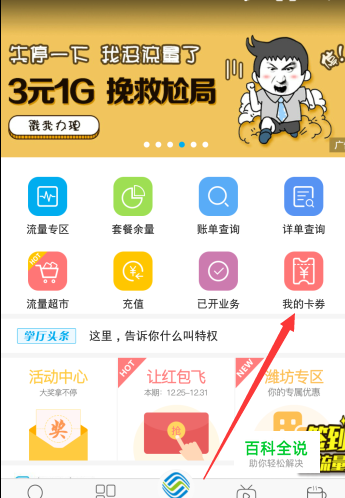 进入移动掌厅首页,点击“我的卡券”。
