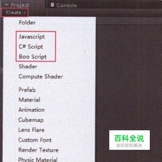 启动Unity应用程序,在Project视图中的assets文件夹内通过右击弹出的 列表框创建脚本,如图所示。