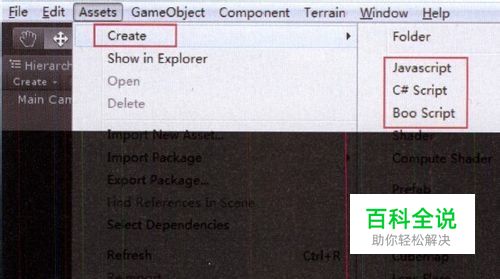 Unity支持三种汇编语言,分别是JS、c#和Boo。创建脚本的方法主要有三种,首先启动Unity,单机菜单栏中的Assets->Create来添加脚本。