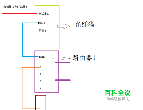第六步,关键,请看下图 注意看左上角,光钎猫的地址和路由器的地址都是192.168.1.1,地址相同,便会导致冲突,无法上网,如果线路已经接着以太交换机和路由器,去改掉路由器地址,改掉地址后可能会出现无法登录路由器。所以,千万要按照第一张图的接法接好先,不要接其他的东西。更改地址方法如下图: