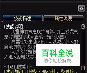 开始之前,我们要来看看雷神之息这个技能的作用。 意思就是说,第一,会落雷(天帝过图落雷就是因为这个技能) 第二、让技能属性伤害为光属性 第三、减少敌人魔法防御力(意味着提升输出)