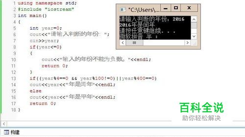 using namespace std; #include "iostream" int main() { int year=0; cout<<"请输入判断的年份:"; cin>>year; if(year<=0) { cout<<"输入的年份不能为负数。"<<endl; return 0; } if((year%4==0 && year%100!=0)||year%400==0) cout<<year<<"年是闰年"<<endl; else cout<<year<<"年是平年"<<endl; return 0; }
