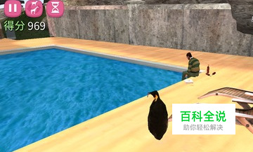 2、最上面有一个游泳池,泳池旁有个人,人旁边有条毛巾。