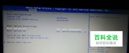 设置优先启动顺序。此时,回到“Boot”选项卡,可以看到Boot Option Priorities至少有两个选项可供选择“Boot Option #1”和“Boot Option #2”,与下面黄色框中内容是一一对应的,“#1”对应“Hard Drive”(硬盘),“#2”对应“CD/DVD Drive”(光盘),这时候系统仍然默认优先使用硬盘启动,我们选择“Boot Option #1”选项,使用“回车”键将其关闭,这样系统就将首先使用光盘启动了。