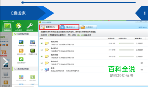 1.C盘搬家 打开360安全卫士的功能大全,点击C盘搬家,把内存大的文档和程序进行搬家。